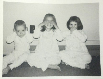 This is one in a series of posed shots my father took when we were young – Jeff, Chris and I, happily avoiding evil in the classic “Three Wise Monkeys” proverb. We thought it was funny, and clearly fun from the looks on our faces. I had no idea at the time of the meaning, but was interested to see this description on Wikipedia: